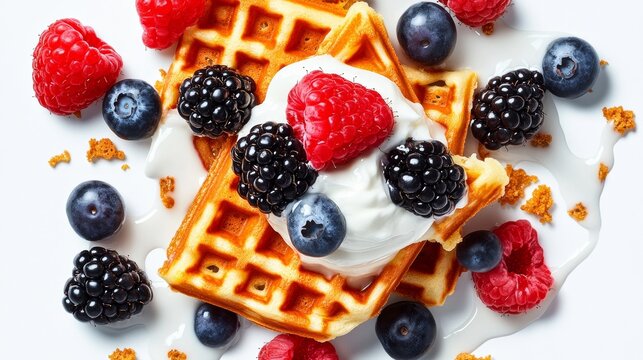 Waffle topped with blueberries, raspberries, and whipped cream. Concept of indulgence and satisfaction, as the combination of sweet and fruity flavors is both visually appealing and delicious