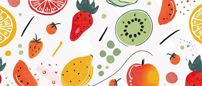 Colorful hand-drawn fruit pattern with strawberries, kiwis, lemons, and other fruits on a white background. Perfect for food-related designs.