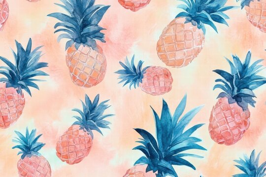 Joyful watercolor pineapple pattern with vibrant colors against a soft peach background perfect for tropical themes. Generative AI