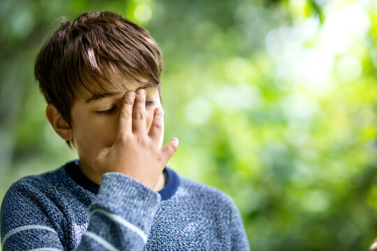 Struggling schoolboy holding his head while sitting in school class against the backdrop of the blackboard. Created with Generative AI technology.