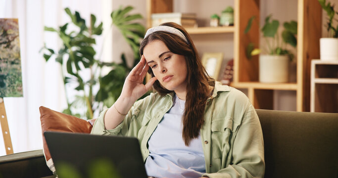 Thinking, tired and woman on sofa with laptop with stress for exam, test and assessment for university. Burnout, home and girl with worry, frustrated and problem for studying, education and learning