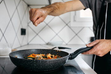 Man sprinkling salt on vegetables in frying pan