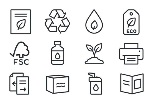 Eco Printing Icons. Outline icon set of print-on-demand eco solutions: printing press, recycled paper, soy ink
