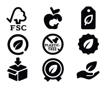 Eco Certification Icons. Solid, filled icons set of eco label and certification icons: FSC label, compost
