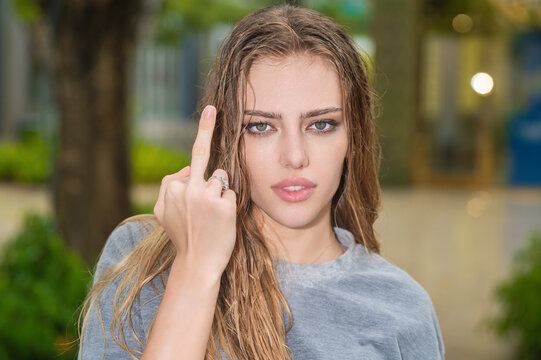 Red-haired girl showing middle finger gesture. Redhead Woman showing a fuck you off sign. Close up