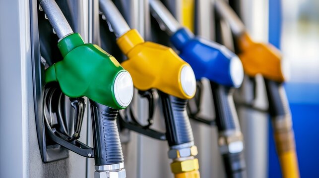 Colorful fuel pumps lined up at a gas station, showcasing different fuel types and their nozzles