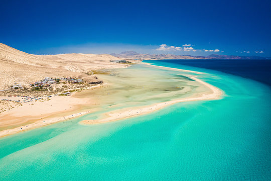 Aerial view of Sotavento beach lagoon in Costa Calma, Fuerteventura, Canary islands.