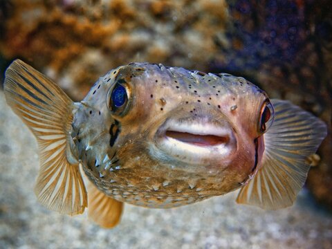 Fugu puffer blowfish fish Arothron Hispidus in aquarium as nature underwater sea life background