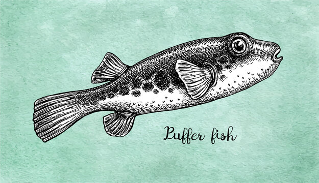 Alive swimming puffer blow fish Japanese fugu sashimi meal in fish market restaurant tank