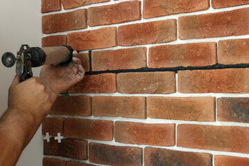 Applying grout to the joints between tiles. The seam is filled with the prepared mixture using a gun. A trowel gun at work. Seams between tiles are filled with a syringe gun.