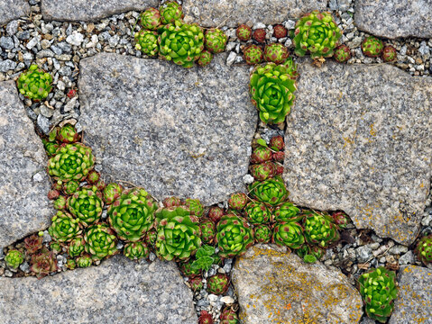 Stone rose or Sempervivum between granit stones, top view of growing houseleeks in fugue