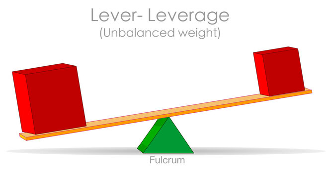 Leverage. Lopsided of two objects of different weight. Unbalance scale, lever pry. Red big, heavy cube, light box. Unstable age ratio. Same distance to fulcrum. Physics, economic, politic. Vector