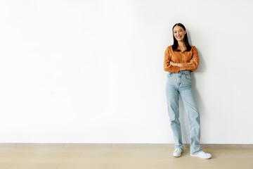 Smiling young woman in casual outfit posing with folded arms standing over white wall background, full body length shot