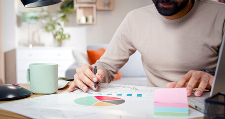 Close up portrait of bearded face male sits at table full of papers at home. Man drawing diagrams holds pen in hand.