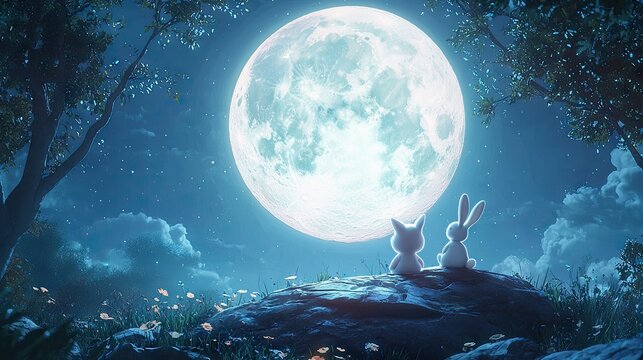 The moon tonight is very round, but not as round as the child's face. The child and the little white rabbit are looking at the moon. In the moonlight, HD resolution, cartoon,hd