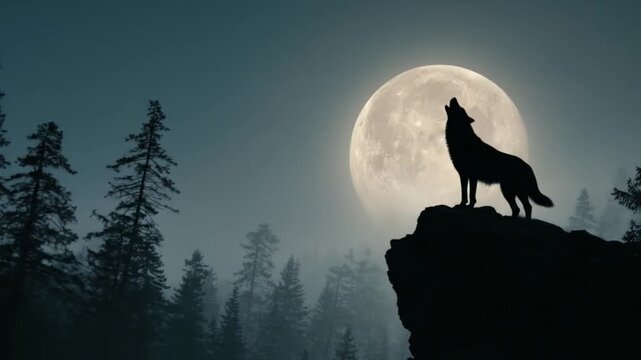 A lone wolf perched on a cliff beneath a full moon, forests looming in misty darkness, awe. tonight