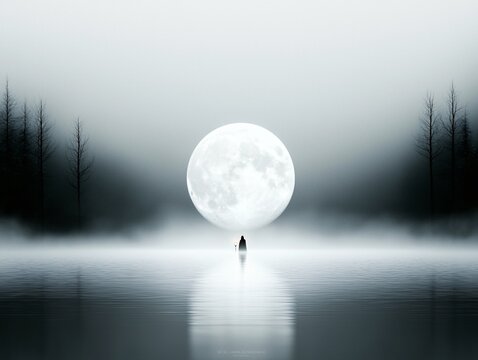 An enchanted lake under a glowing full moon, mist rising from the water, soft blue and silver tones, otherworldly reflections, a mysterious robed figure holding a lantern, fantasy atmosphere,