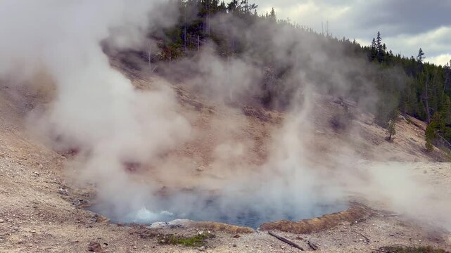 Scenic landscape view of a pool of boiling hot water and steam being forced out of a fumarole at the Beryl Spring in Yellowstone National Park