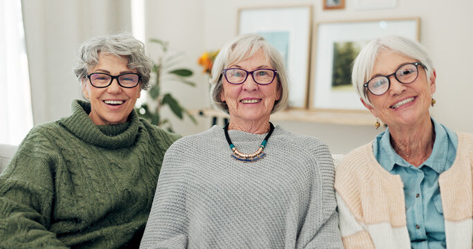 Face, glasses and senior friends in home, having fun and bonding together. Portrait, smile and group of elderly women with eyewear, happy and enjoying quality time to relax in house for retirement