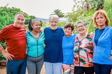 Group of diverse senior friends have fun after workout session at park - Active lifestyle, health and wellness concept