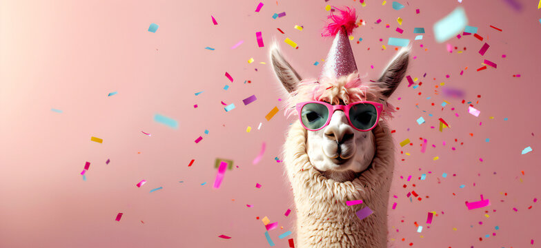 Funny pink llama alpaca in sunglasses and birthday cap with confetti flying all around on pastel pink background. Birthday card concept.