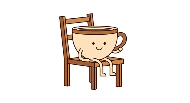 A cute cartoon cup of coffee character taking a break seated on a wooden chair