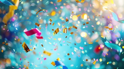 Colorful confetti falling on blue background, festive birthday party decoration. Vibrant celebration atmosphere with multicolored paper pieces. Perfect for parties, celebrations, and joyful events.