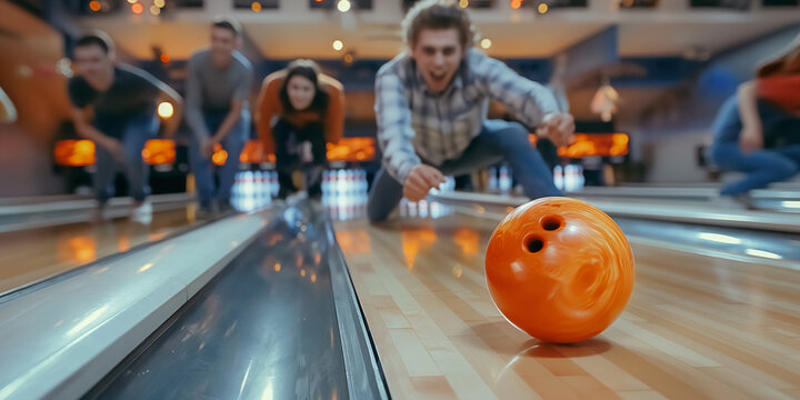 Group of friends enjoying time together laughing and cheering while bowling at club.