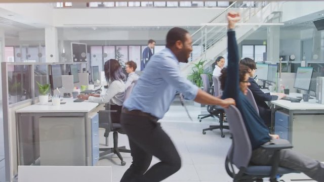 Cheerful Employee Pushes His Handsome Colleague on a Chair Next to Rows of Desks with Diverse Business People Working on Desktop Computers in Modern Office Space.
