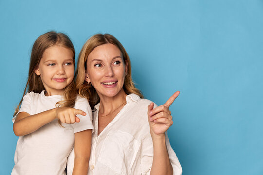 Mother and daughter happily pointing at something in a portrait photo against a blue background