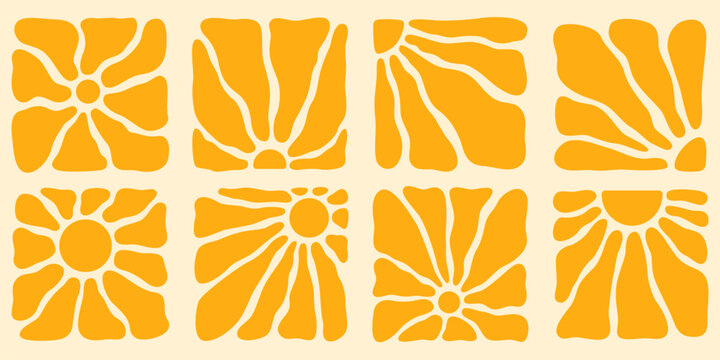 Boho groovy sun patterns with abstract yellow shapes and retro floral designs for vintage backgrounds or decorative wallpaper in bohemian style. Modern artistic elements for creative design work.