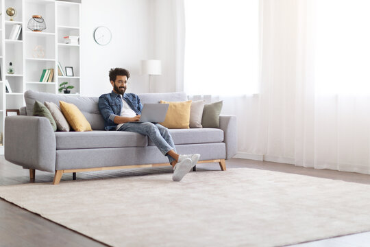 Relaxed woman enjoying national lazy day with laptop on sofa