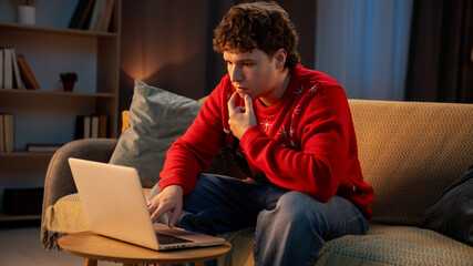 A young male is sitting on a couch looking up information on a laptop. The male is wearing a festive Christmas red sweater.