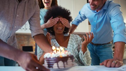 Staff celebrating birthday of female colleague in architects office with surprise cake - shot in slow motion