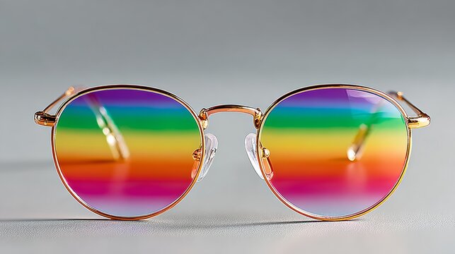 Pair of rainbow colored sunglasses with a gold frame. The sunglasses are on a white surface. The sunglasses are colorful and bright, giving off a fun and cheerful vibe