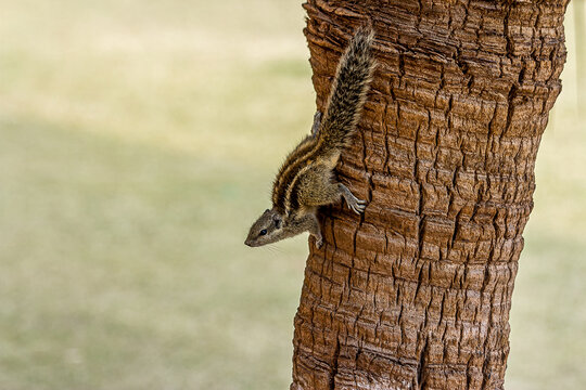 A small fluffy Indian palm squirrel climbs down a tree trunk upside down. Big fluffy tail. This animal is also known as Funambulus palmarum, three-striped palm squirrel. Looks like a chipmunk.