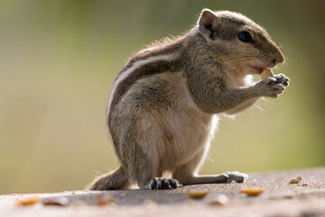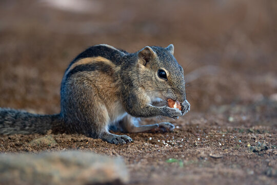 Closeup of an Indian palm squirrel (Funambulus palmarum) eating while standing on a stone surface
