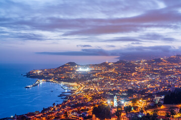 Dusk over the iIluminated city of Funchal viewed from Sao Goncalo, Madeira island, Portugal, Atlantic