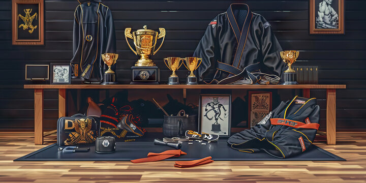 Brazilian Jiu-Jitsu Instructor's Desk: A functional training mat with various martial arts equipment, including a uniform and trophies, reflecting the disciplined lifestyle and expertise