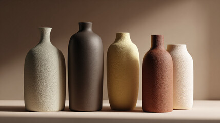 A collection of minimalistic, aesthetically pleasing ceramic vases in a row, with warm, earthy tones. The soft lighting highlights the texture of each vase.
