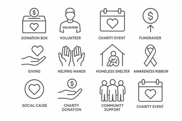 A set of vector icons for charity, donation, and community support, including a donation box, helping hands, and awareness ribbon