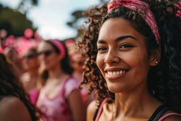 A joyful woman surrounded by friends raising funds at a breast cancer fundraising walk