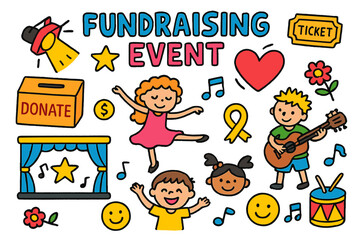 Line style icons of fundraising events: charity dinner icon, community walk badge, bake sale table, silent auction gavel, donation concert stage, peer-to-peer fundraiser chart, online campaign banner