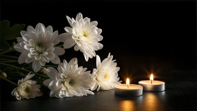 Funeral setup featuring a photo frame, candle, and floral wreath with black ribbon.