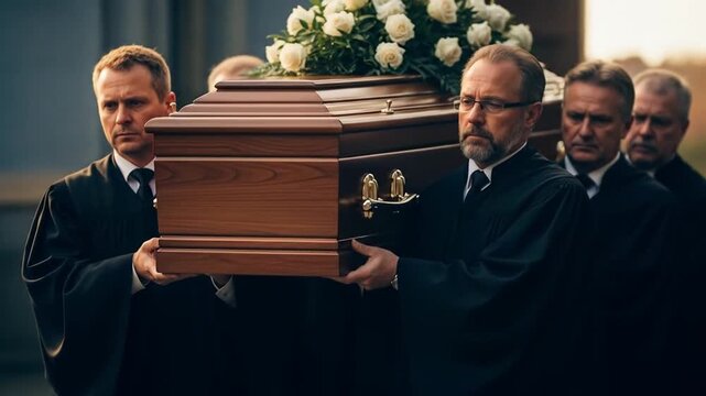 Solemn Pallbearers Carry Casket Adorned with White Roses in Dignified Funeral Procession
