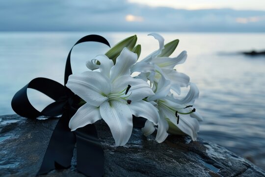 Black funeral ribbon and white lily flowers on a rock by the calm sea