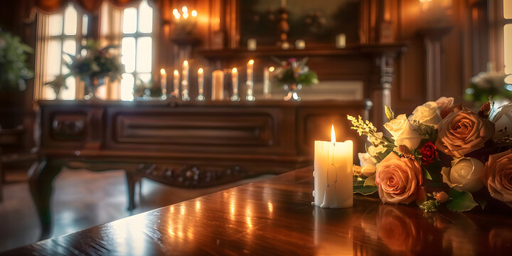 Serene memorial service in a vintage funeral home with flickering candle and quiet contemplation, serene, memorial service, vintage, funeral home, flickering candle, quiet contemplation