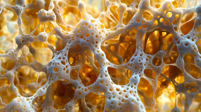 Closeup view of fungal mycelium structure showing the network of mushroom. Organic texture resembling biological tissue under magnification. Ideal for scientific, medical, nature articles