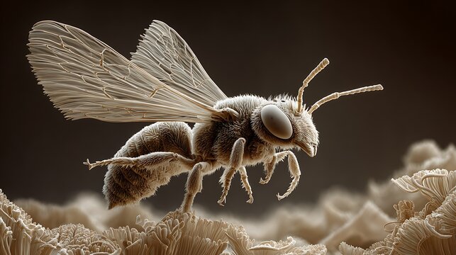 bee in floating fungal spore haze, micro dust cloud