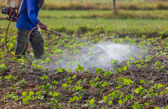 Farmer spraying pesticide on peanuts field.